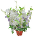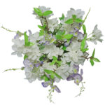 With this centerpiece, you can bring some spring cheer into your house or workspace. Cherry blossom flowers and an orchid plant are displayed atop a bed of dark green Ivy leaves. This ornament is a great choice for a strong centerpiece because of its deep saturation. To create a mood-lifting arrangement, nestle this arrangement with a white candle holder or a silver vase set.