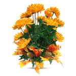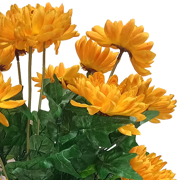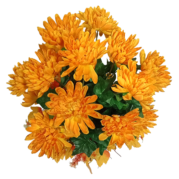Lovely, fluffy, and vibrant! The Mum flowers, with its strong growth, represents expansion, sincere sentiments, and fortune. Including this arrangement in your decorations will add a refreshing and exotic appeal as well as sophistication to your party or home. The bouquet is finished off with stunningly realistic greenery that adds an enticing touch. Unlike their fresh counterparts, these silk blooms will remain vivid, beautiful, and blossoming indefinitely, exuding eternal festive colors of delight all around!
